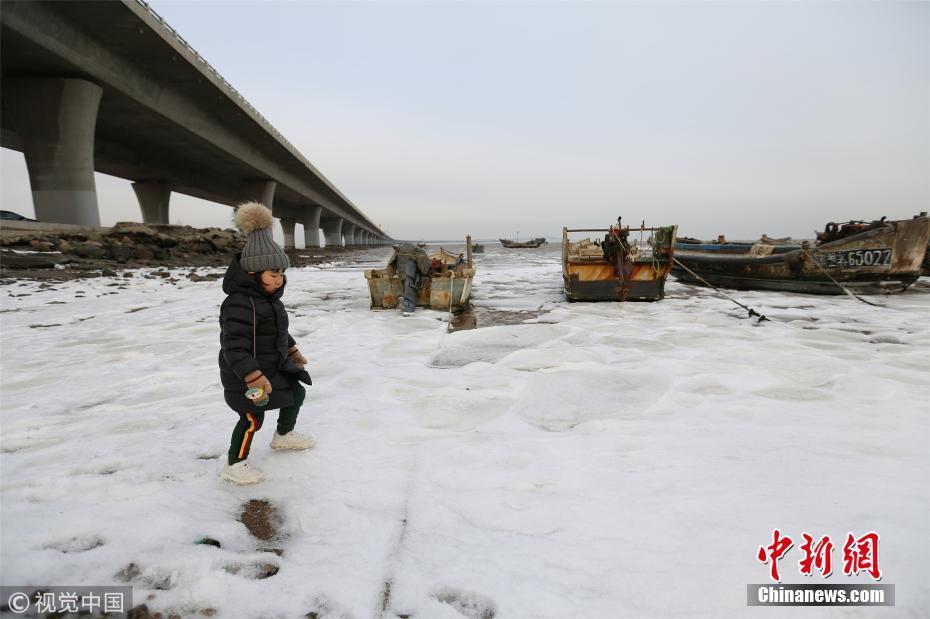 12月9日,受大風(fēng)降溫天氣影響,青島膠州灣北部冰情初現(xiàn),青島西海岸新區(qū)膠州灣跨海大橋入口處海冰層層疊疊,暫未對海上漁業(yè)生產(chǎn)帶來影響。張進(jìn)剛 攝 圖片來源:視覺中國