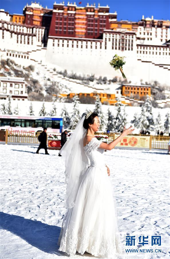 12月19日,一名女士在布達(dá)拉宮廣場上拍婚紗照。 12月18日,西藏拉薩市迎來今年入冬以來的首場降雪。19日清晨,拉薩雪后初霽,處處銀裝素裹,盡顯雪域高原之美。 新華社記者覺果攝