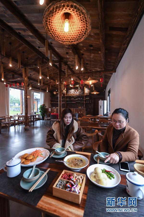 12月19日,章淑貞(左)在民宿“初憶小院”內(nèi)請一名客人品嘗自己做的點(diǎn)心。該民宿是河橋鎮(zhèn)“90后”女孩章淑貞開辦的,民宿融入了大量的現(xiàn)代建筑設(shè)計(jì)風(fēng)格,深受年輕人的喜愛。  新華社記者 徐昱 攝