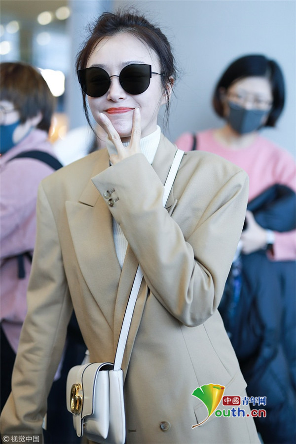 11月29日,上海,秦嵐現(xiàn)身機場。她戴白色鴨舌帽,穿白色星星圖案外套配微喇牛仔褲,架黑超涂紅唇笑靨如花。