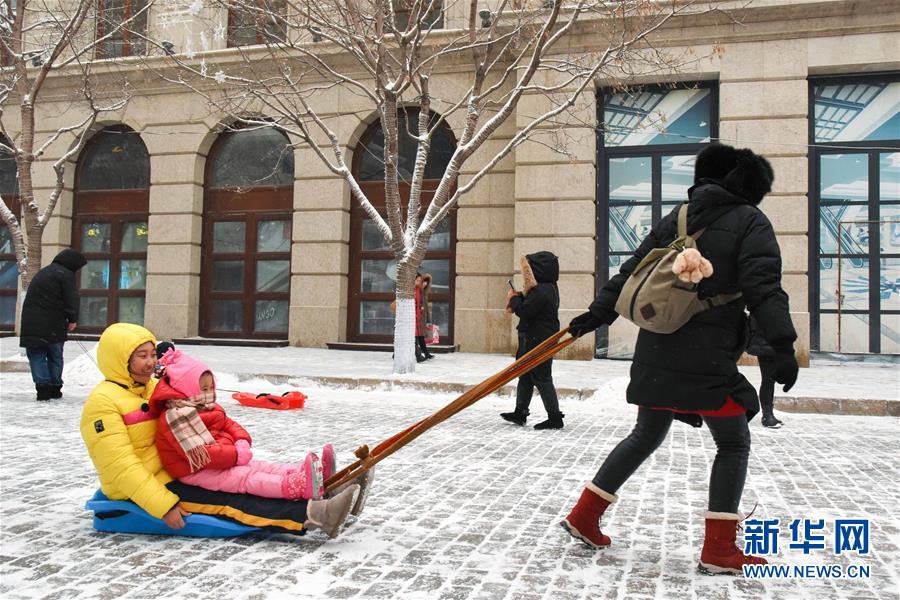 12月21日,游客在哈爾濱中央大街玩耍。當(dāng)日,“冰城”哈爾濱迎來降雪天氣,整個城市變得銀裝素裹。新華社記者韓宇攝