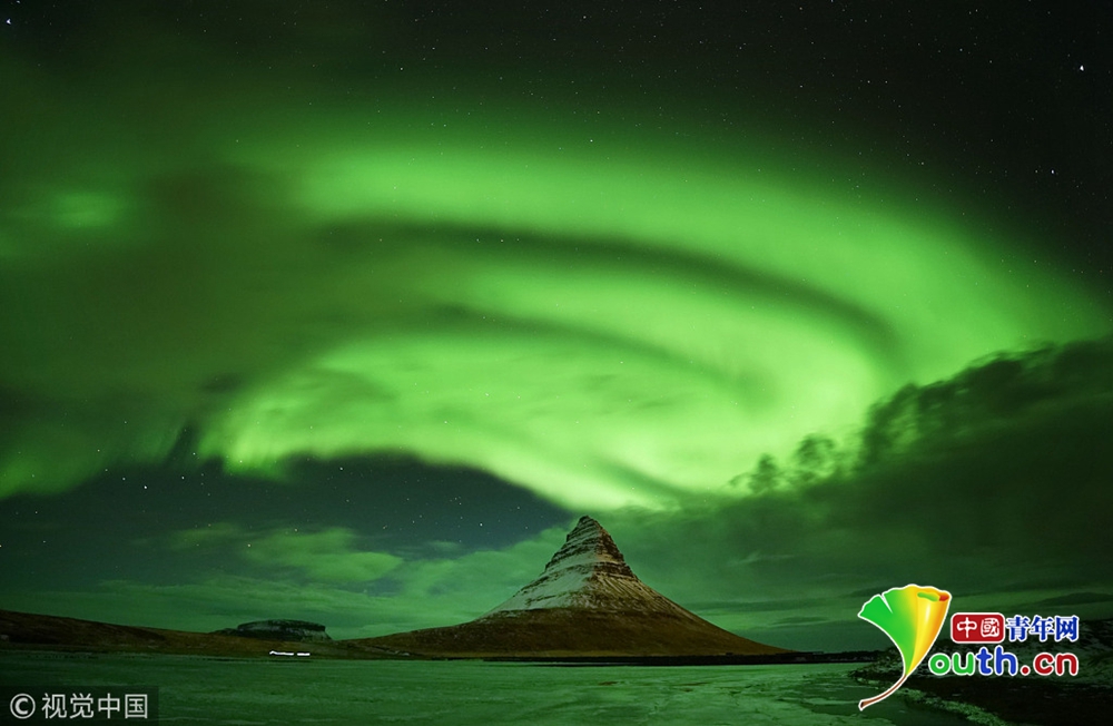 近日,冰島西海岸高463米的Kirkjufell山上空出現(xiàn)極光。