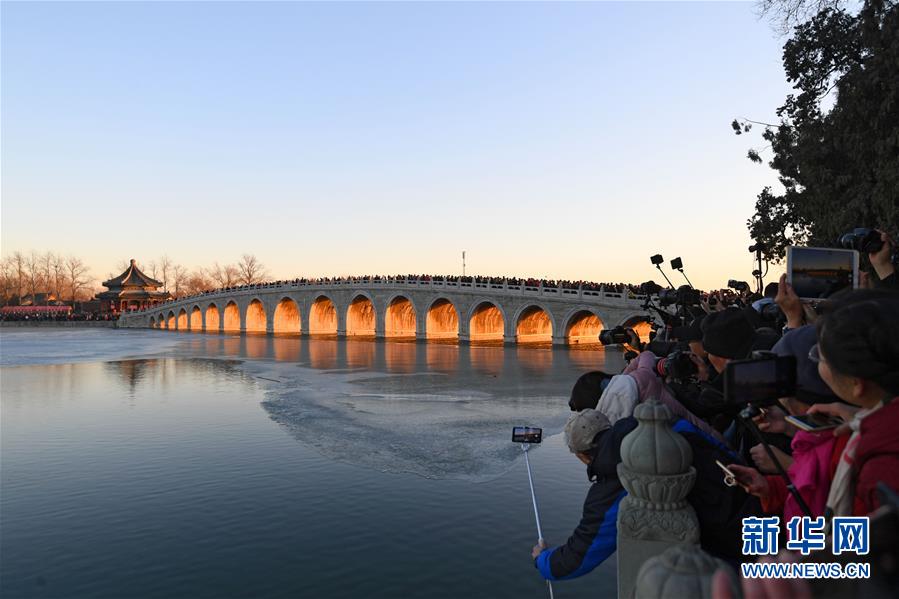 12月23日,游客和攝影愛好者在拍攝頤和園十七孔橋“金光穿洞”美景。 當日,北京頤和園十七孔橋出現(xiàn)“金光穿洞”美景,吸引許多游客和攝影愛好者前來觀賞拍攝。 新華社記者陳曄華攝