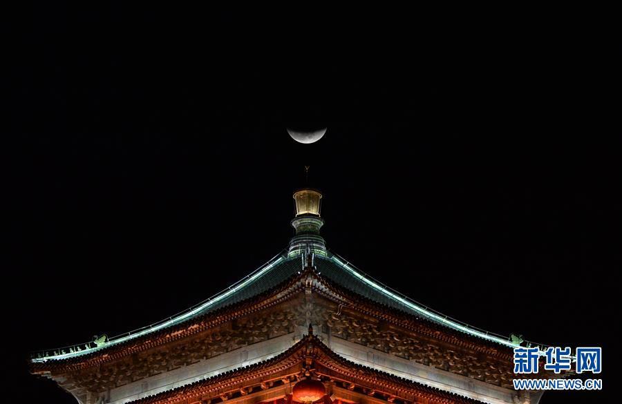這是1月31日在陜西省西安市鐘樓拍攝的月亮。 在即將過去的2018年,各地攝影師用鏡頭記錄下四季中國。大江南北,一幅幅色彩斑斕的美麗畫卷徐徐展開。 新華社記者 李一博 攝