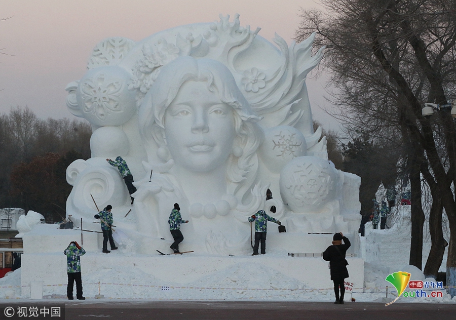 國內(nèi)最大的雪雕盛會(huì)太陽島雪博會(huì)正在緊鑼密鼓建設(shè)中,雪雕師正在精雕細(xì)刻打磨中。