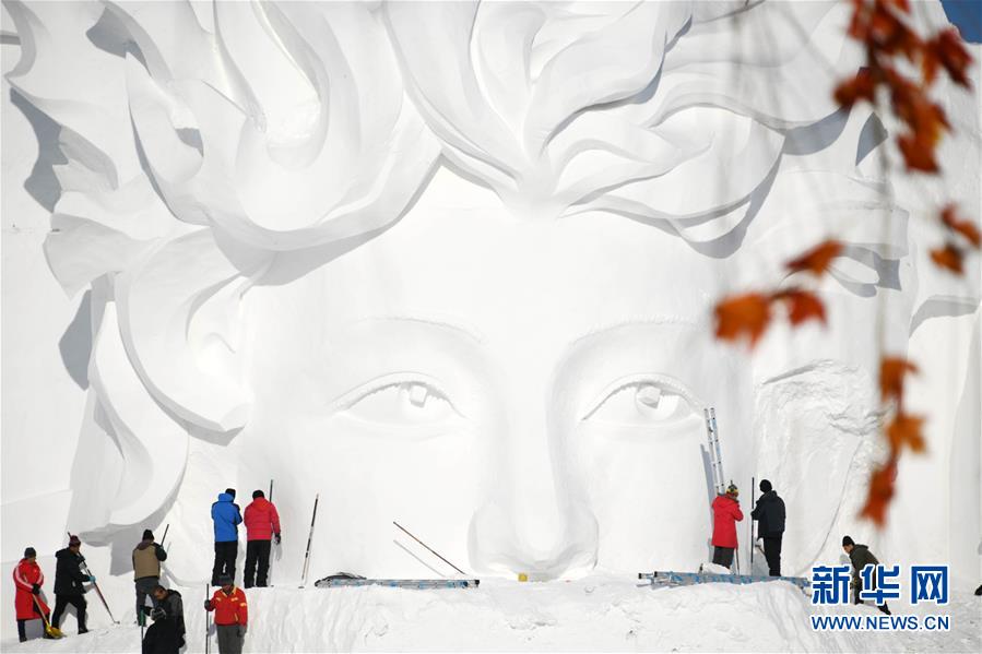 2018年12月13日,黑龍江省哈爾濱市,國內(nèi)最大的雪雕盛會(huì)太陽島雪博會(huì)正在緊鑼密鼓建設(shè)中,部分雪雕雛形已現(xiàn),雪雕師正在精雕細(xì)刻打磨中。