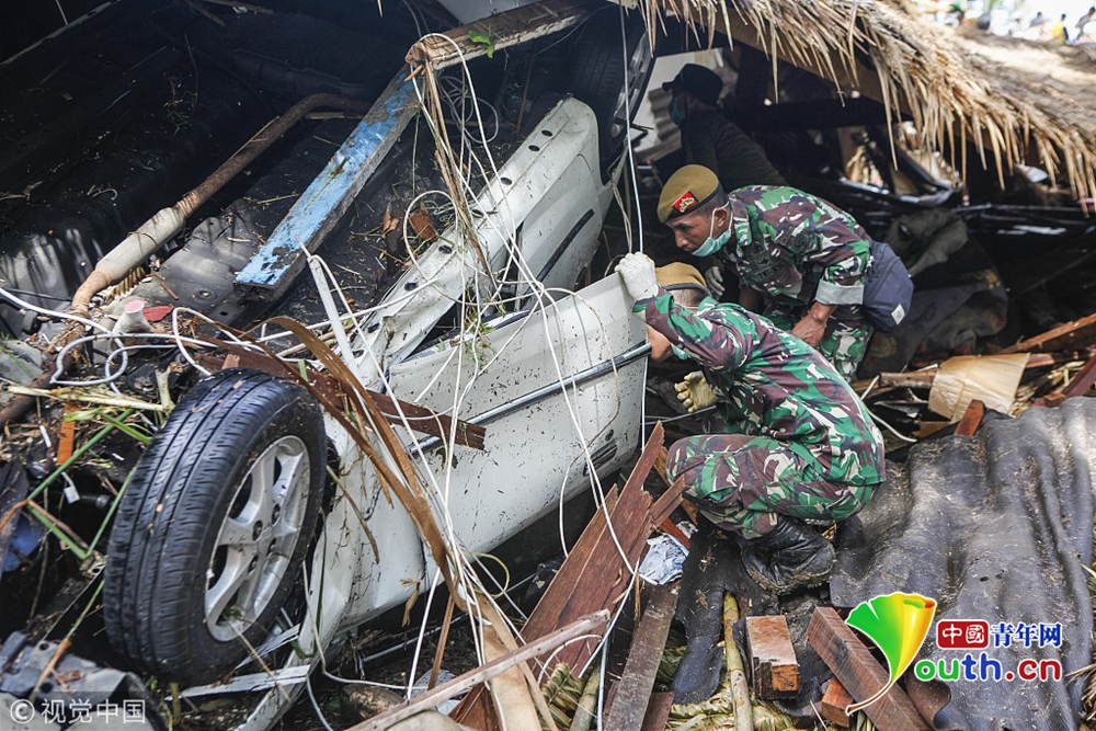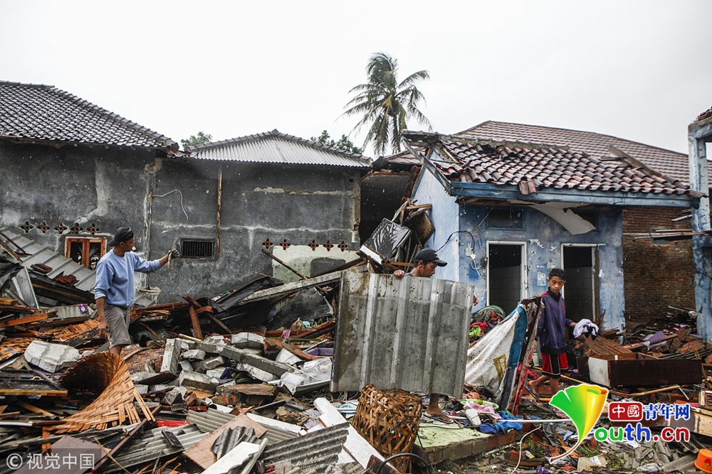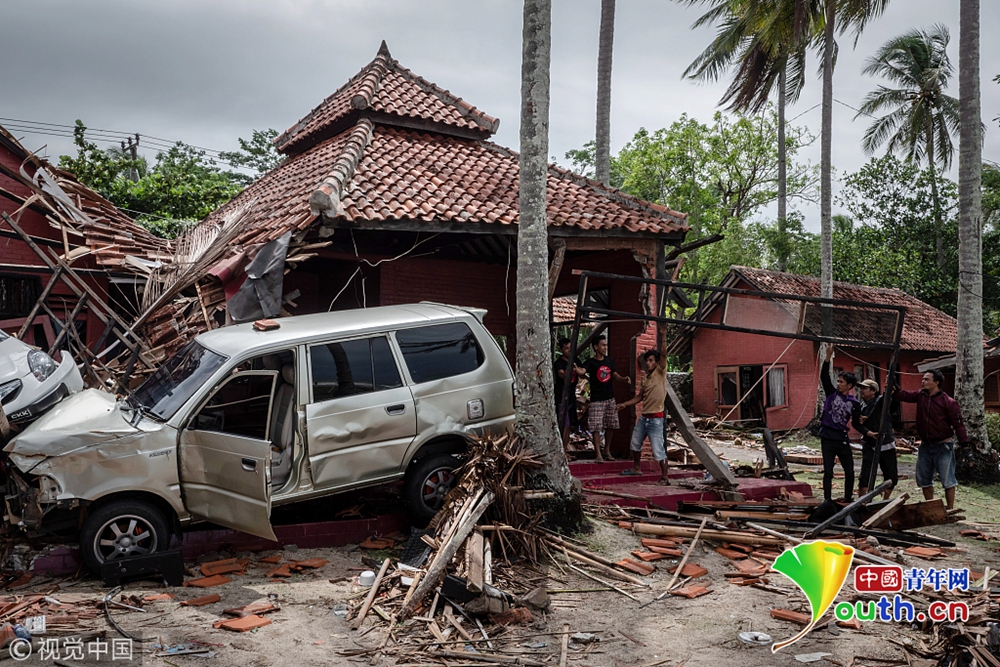 12月24日,受災民眾在印尼萬丹省海嘯災區(qū)進行清理工作。 印度尼西亞抗災署發(fā)言人24日說,印尼西部巽他海峽海嘯死亡人數(shù)已經上升至373人。 新華社記者 張可任 攝