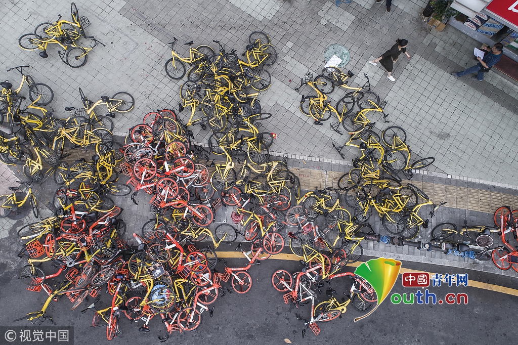 2018年11月9日,深圳落戶。城中村口,路邊堆積的共享單車。