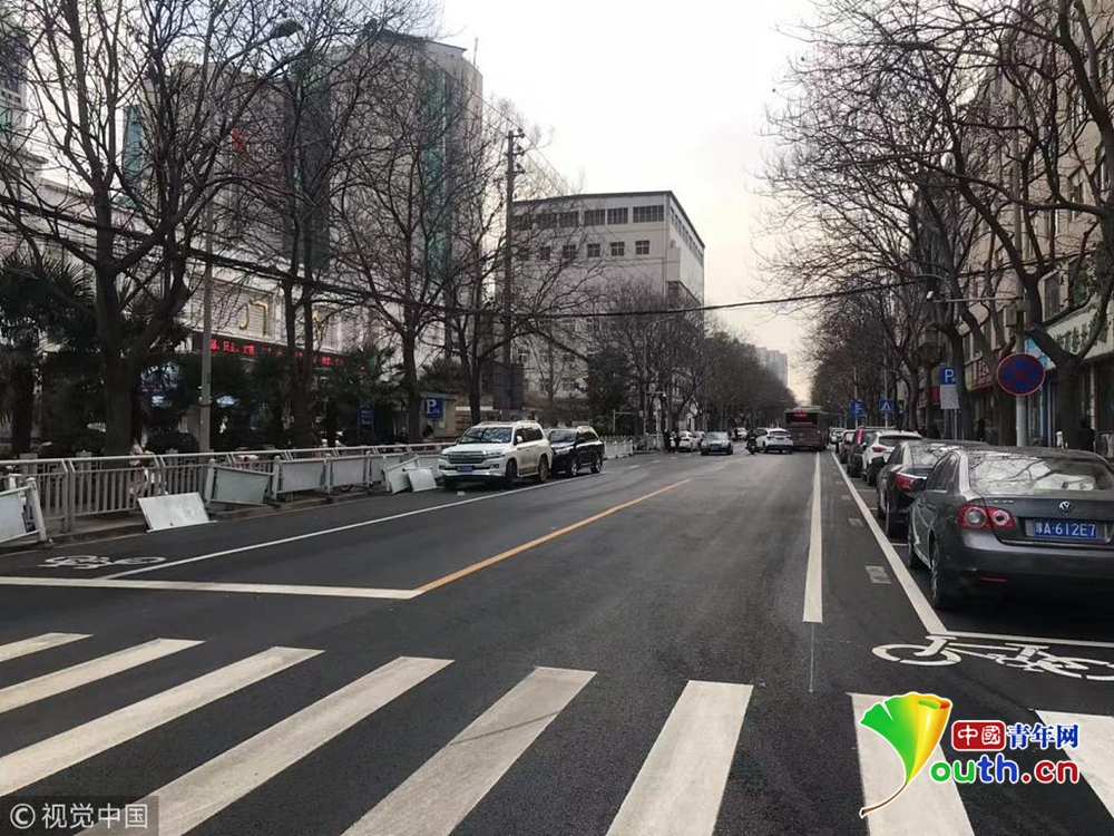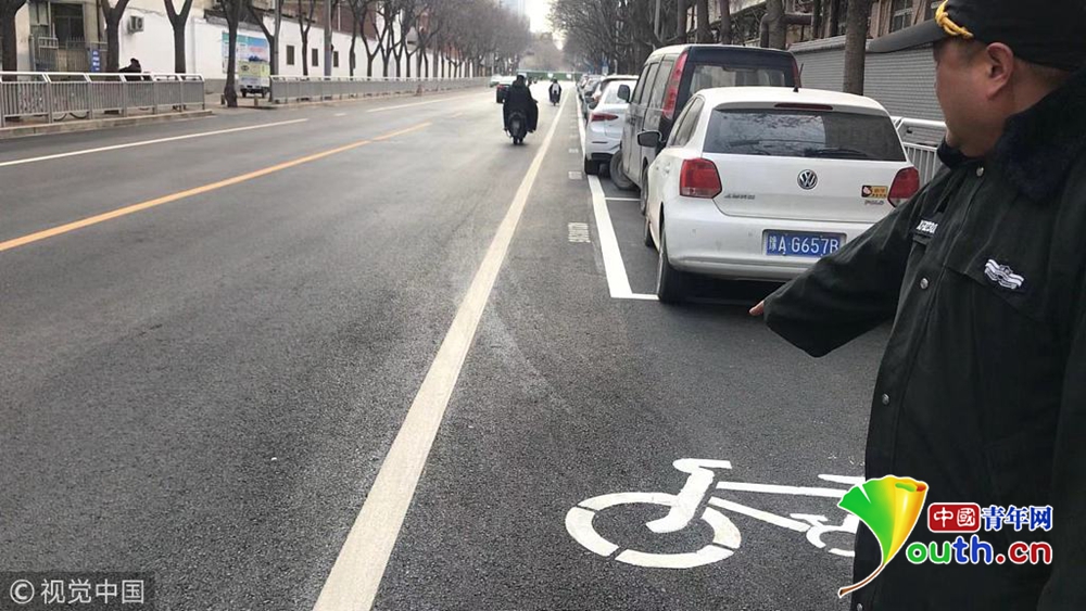 現(xiàn)場,文化宮路與友愛路口附近,新鋪好的路面被劃上了嶄新的行車線和停車位標(biāo)線。從文化宮路和友愛路交叉口向北,道路東側(cè)的非機動車道被停車位占去后,僅剩下0.8米左右的寬度。同樣在路口南側(cè),道路西側(cè)的非機動車道也被新劃的停車位占去,僅剩不足1米的寬度。
