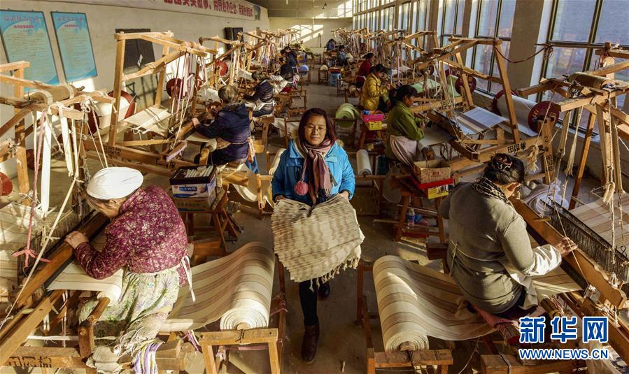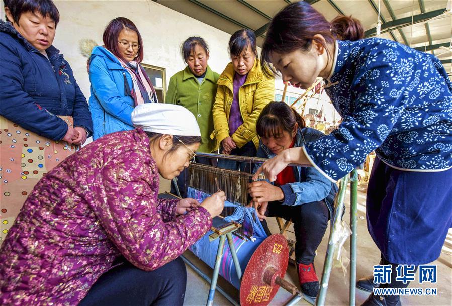 12月25日,在衡水市冀州區(qū)一家老粗布生產(chǎn)企業(yè),田園棉手織粗布傳承人(左)在指導(dǎo)村民織布。 2018年以來,河北省衡水市冀州區(qū)依托當(dāng)?shù)氐氖〖壏沁z田園棉手織粗布技藝資源,采取“非遺+扶貧”的模式,通過非遺傳承人開展技能培訓(xùn)、老師傅傳幫帶等,讓貧困村民在傳承非遺文化的同時(shí)學(xué)習(xí)傳統(tǒng)技藝,助力脫貧致富。 新華社記者 李曉果 攝