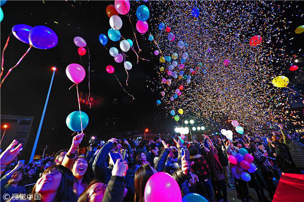 2017年12月31日,天津大悅城,市民們放飛氣球,迎接2018的到來。