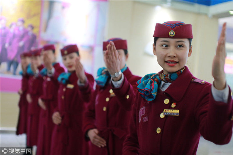 2018年12月27日,四川成都,為備戰(zhàn)即將開通的成雅鐵路,中國鐵路成都局集團有限公司成都客運段動車二隊對成雅動車的乘務人員進行理論、形體、服務禮儀等內(nèi)容的培訓。