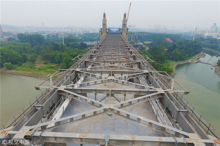 2017年9月19日,南京長江大橋正橋的混凝土面板已經(jīng)全部拆除,僅剩交錯(cuò)縱橫的鋼桁架橫跨在長江之上,從高空俯瞰猶如一條“鋼鐵巨龍”。
