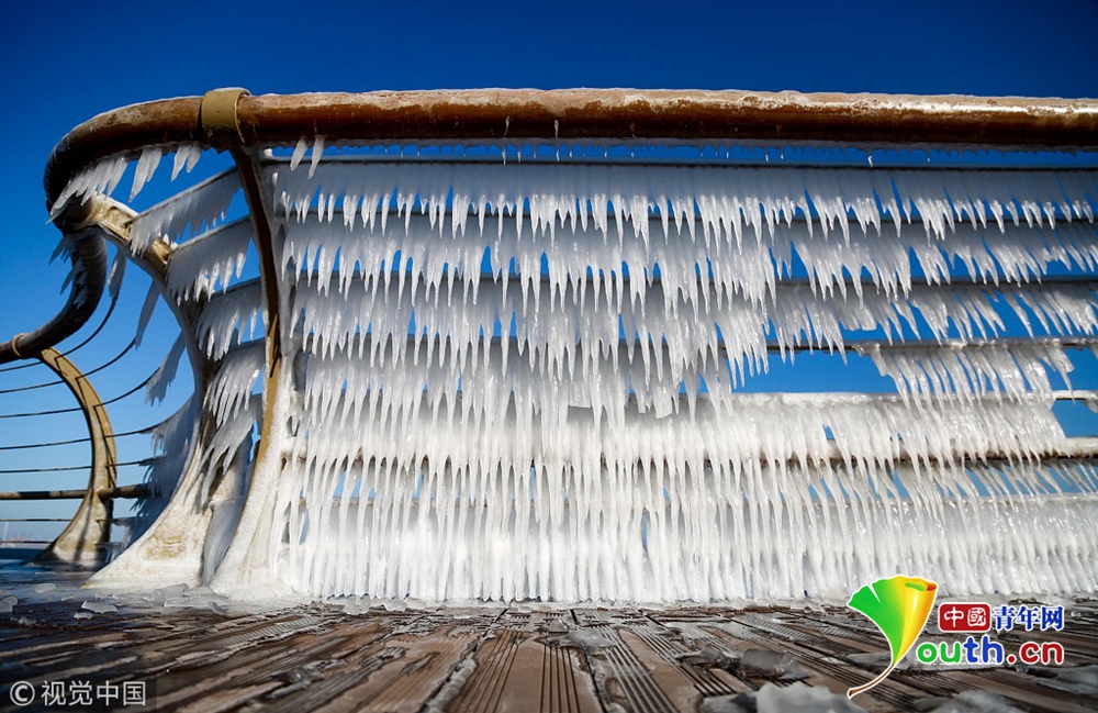 晶瑩剔透的冰凌錯落有致的懸掛在東港海岸的木棧道護欄上。