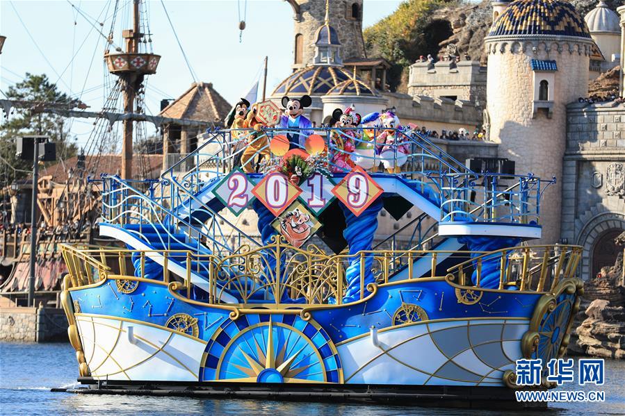 1月1日,在日本東京迪士尼樂園,扮成迪士尼卡通形象的演員們?cè)谟未舷蛴慰椭乱狻?新華社記者杜瀟逸攝