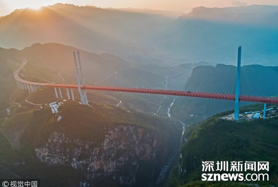 當(dāng)日,杭瑞高速貴州省畢節(jié)至都格(黔滇界)公路北盤江大橋上云霧繚繞,美景如畫。北盤江大橋主橋跨徑720米,橋面到谷底垂直高度565米。
