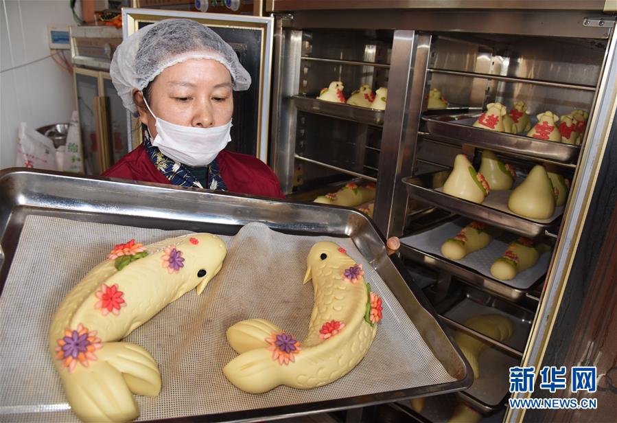 1月8日,工作人員展示剛出籠的“連年有魚”花餑餑。  新華社記者 李紫恒 攝
