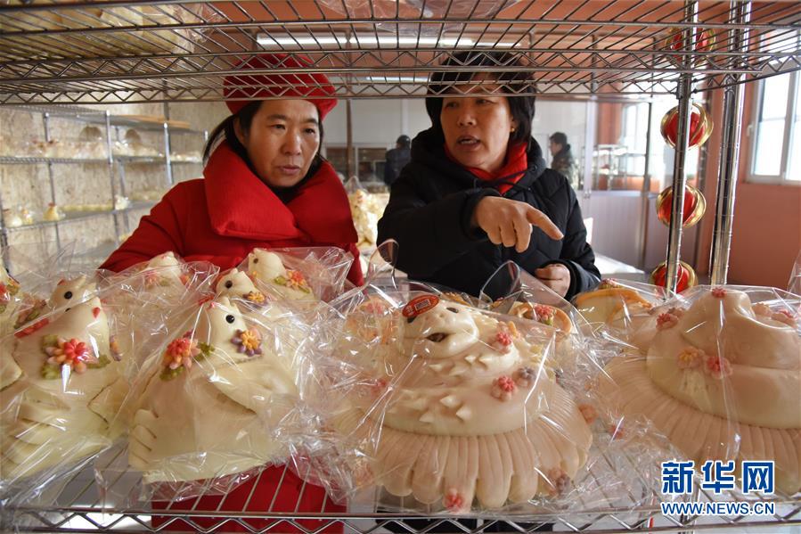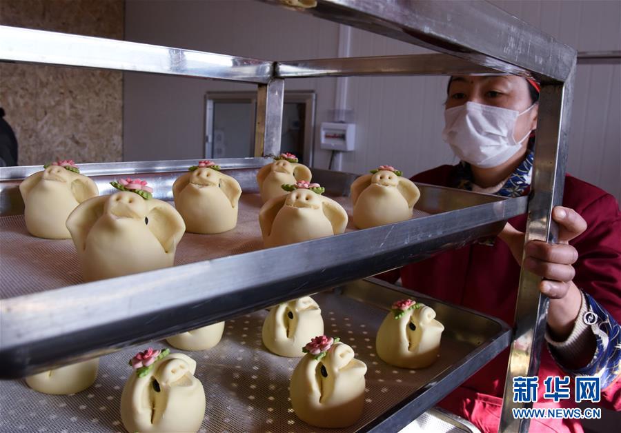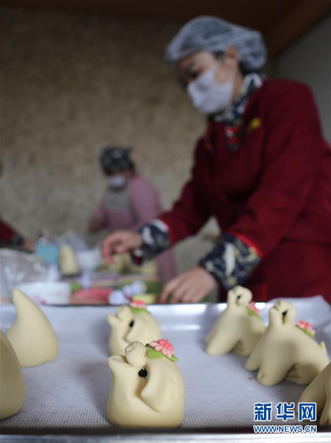 1月8日,工作人員準備將做好的花餑餑放入蒸箱。  新華社記者 李紫恒 攝