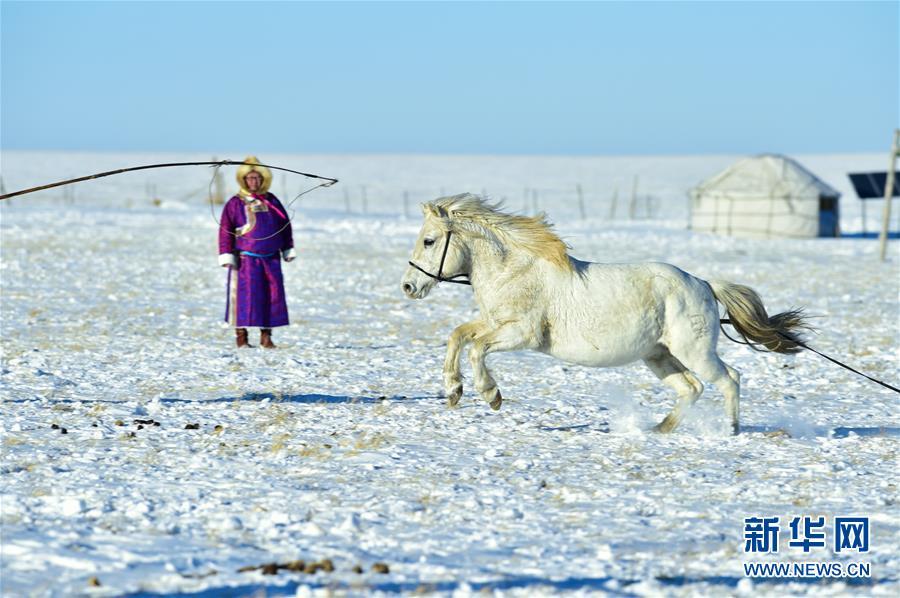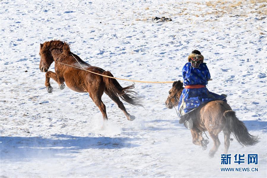 1月8日,牧民在馴服一匹烈馬。 時下正值草原冬季旅游旺季,內(nèi)蒙古自治區(qū)西烏珠穆沁旗的牧民們在雪原上一展身手,為游客展現(xiàn)獨特的民族風(fēng)情。 新華社記者 鄒予 攝