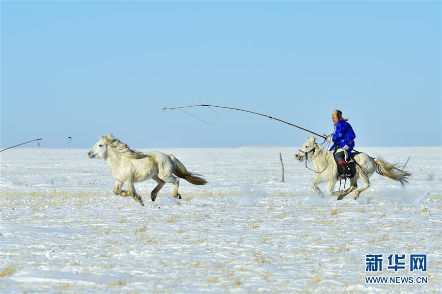 1月8日,牧民進(jìn)行套馬表演。 時下正值草原冬季旅游旺季,內(nèi)蒙古自治區(qū)西烏珠穆沁旗的牧民們在雪原上一展身手,為游客展現(xiàn)獨特的民族風(fēng)情。 新華社記者 劉磊 攝