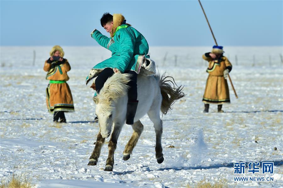 1月8日,牧民在馴服一匹烈馬。 時下正值草原冬季旅游旺季,內(nèi)蒙古自治區(qū)西烏珠穆沁旗的牧民們在雪原上一展身手,為游客展現(xiàn)獨特的民族風(fēng)情。 新華社記者 鄒予 攝