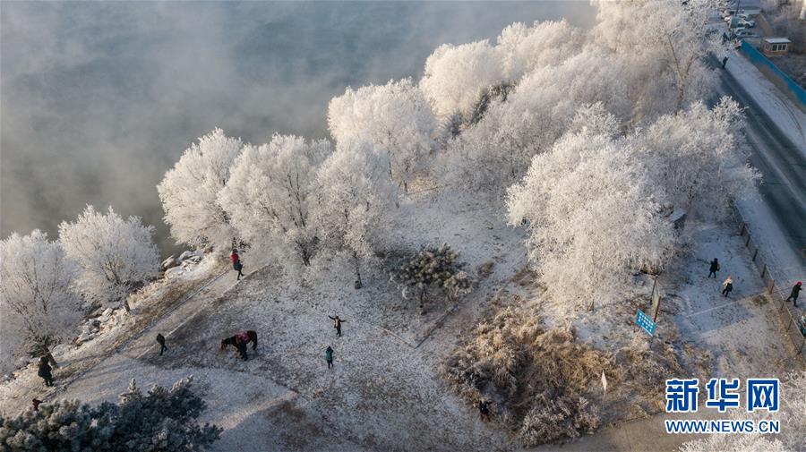 12月12日,游人在吉林省吉林市豐滿區(qū)吉豐東路松花江畔觀賞霧凇美景。