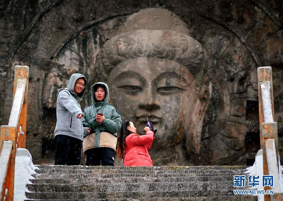 1月9日,游客在雪中游覽洛陽龍門石窟景區(qū)。 新華社記者李安攝