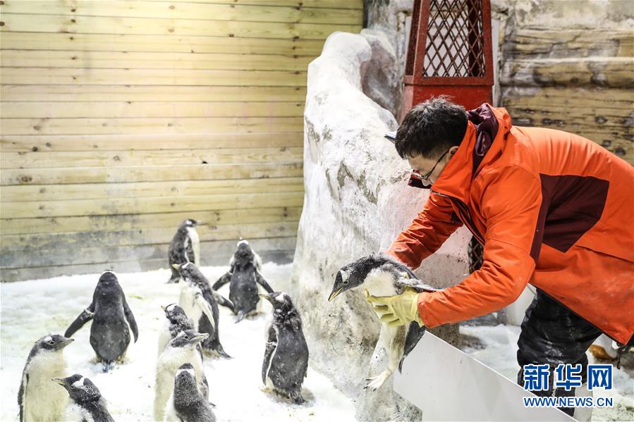 1月9日,馴養(yǎng)員準(zhǔn)備給白眉企鵝寶寶喂食。 新華社記者 潘昱龍 攝