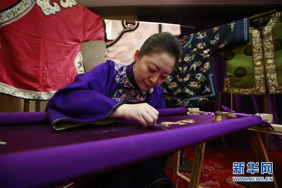 1月12日,在北京“碧泓云想”服裝設(shè)計工作室,高定服裝設(shè)計師畢紅在為中式服裝制作刺繡紋樣。畢紅設(shè)計的中式服裝以棉、麻、真絲等面料為主。春節(jié)來臨,其團(tuán)隊加班加點為顧客趕制中式服裝。