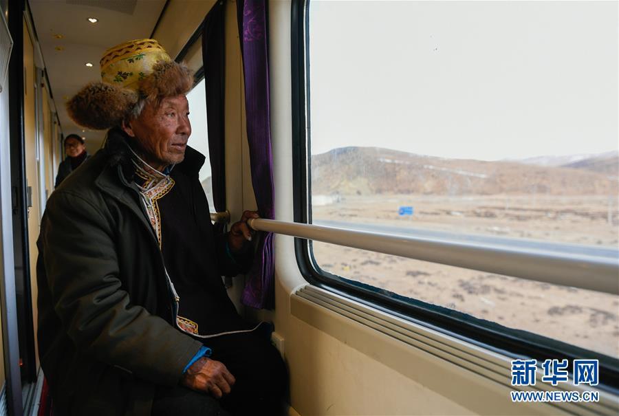 大學(xué)生剛措(右)和桑旦措姆(中)放寒假乘坐Z6802次列車回老家那曲(1月11日攝)。