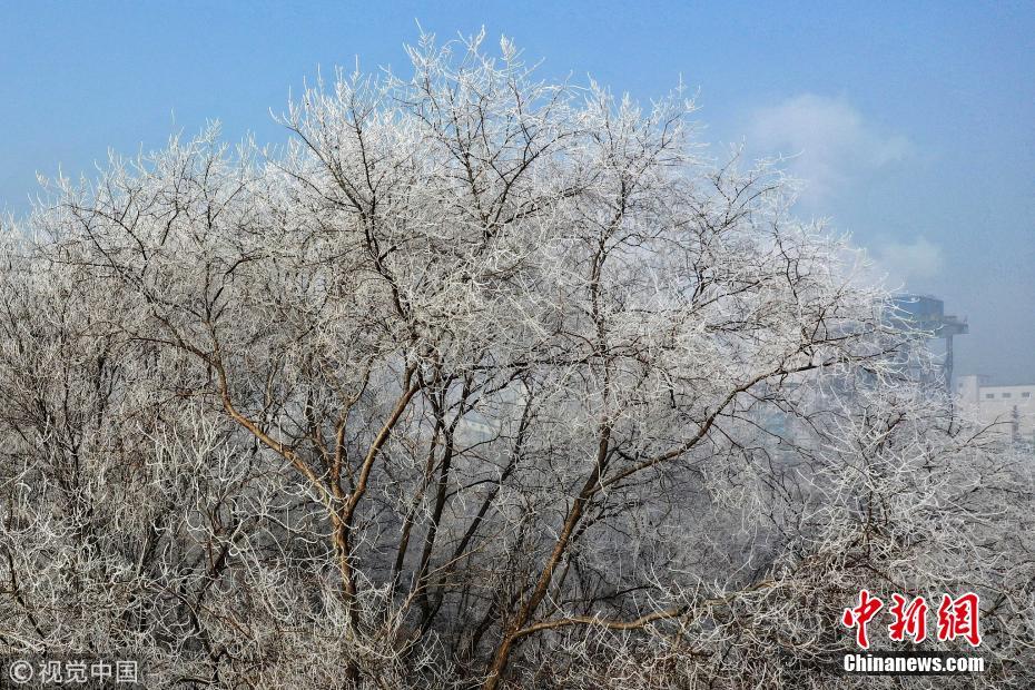 1月13日,霧散日升。河北省邢臺(tái)市大街小巷的樹(shù)枝上掛滿了潔白晶瑩的霜花,藍(lán)天下微風(fēng)吹拂銀絲閃爍,奇麗壯觀。給臘八節(jié)日增添了亮麗的風(fēng)景?;艏t軍 攝 圖片來(lái)源:視覺(jué)中國(guó)
