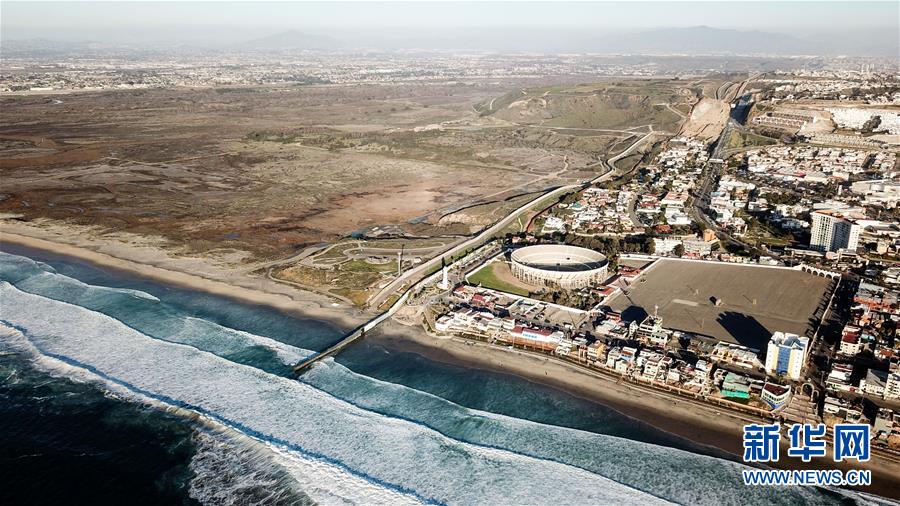 這是1月10日在墨西哥邊境城市蒂華納航拍的美墨邊境墻。畫(huà)面左側(cè)為美國(guó),畫(huà)面右側(cè)為墨西哥。 新華社記者 辛悅衛(wèi) 攝