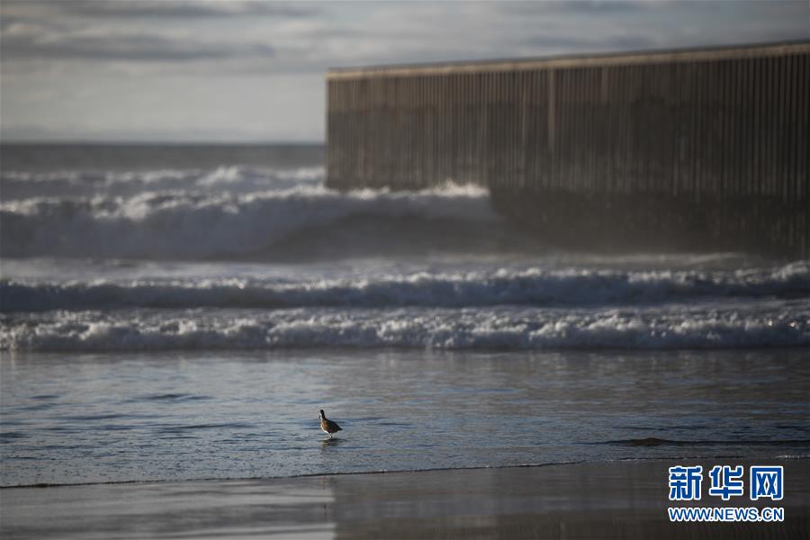 1月10日,在墨西哥邊境城市蒂華納,一只海鳥(niǎo)在美墨邊境墻邊徘徊。新華社記者 辛悅衛(wèi) 攝