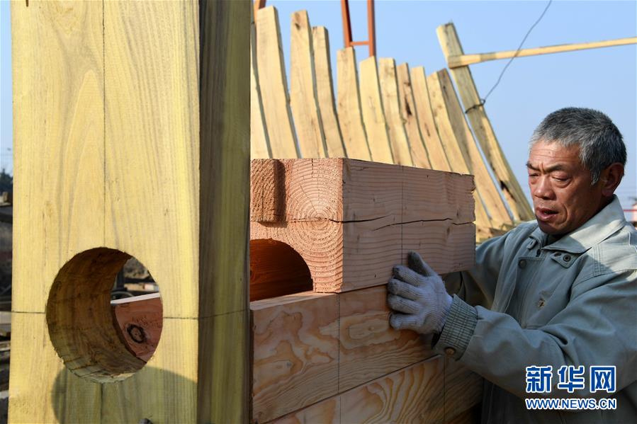 在青島紅雙木造船廠,造船師傅在加固船尾(1月10日攝)。新華社記者 李紫恒 攝