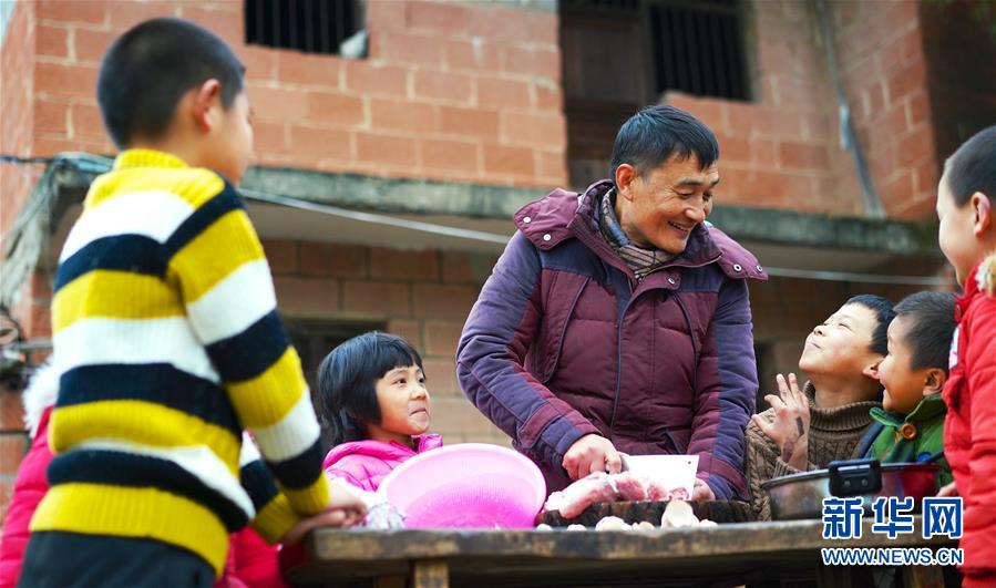 1月3日,章站亮(左三)在學(xué)校的操場(chǎng)上切肉。由于學(xué)校沒有室內(nèi)的廚房和食堂,章站亮只能在露天的環(huán)境下為學(xué)生們準(zhǔn)備餐點(diǎn)。 新華社記者 胡晨歡 攝