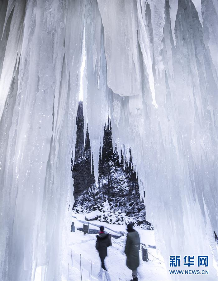 游人在吉林省長白縣十五道溝望天鵝景區(qū)內(nèi)觀賞冰瀑景觀(1月3日攝)。新華社記者張楠攝