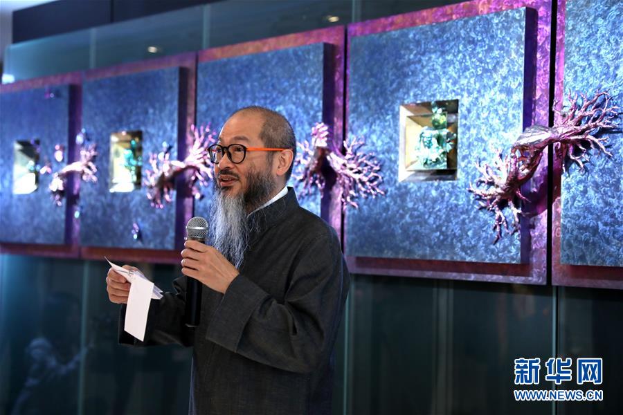 陳世英在自己的作品展覽會上(1月11日攝)。 新華社記者 吳曉初 攝