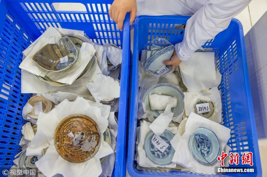 廣東省博物館文物保護(hù)科技中心出水文物保護(hù)實驗室里,修復(fù)后的出水瓷器。譚慶駒 攝 圖片來源:視覺中國
