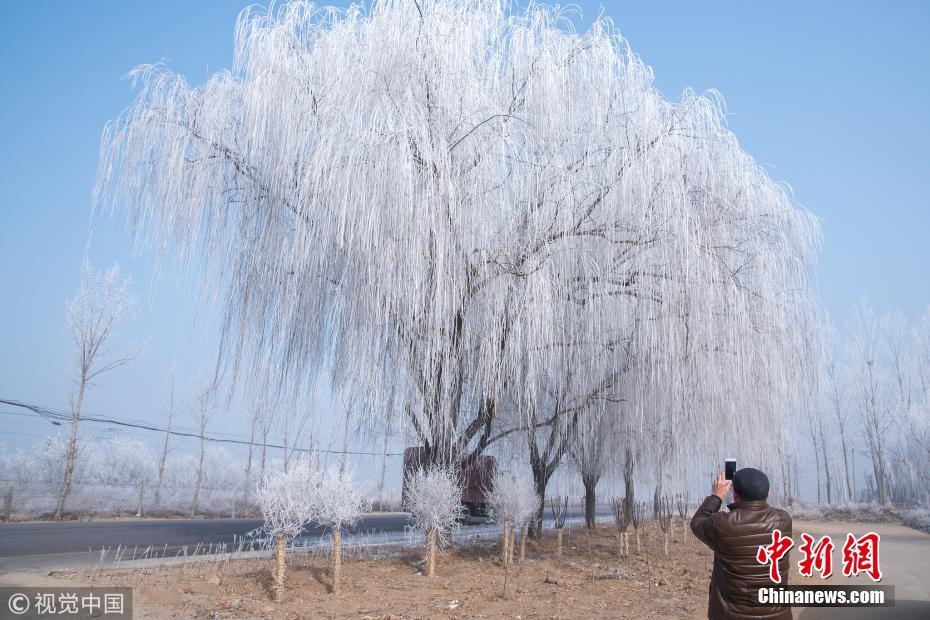 1月13日,107國(guó)道河北省定州路段出現(xiàn)霧凇(樹掛)景觀,吸引路人駐足拍照留念。王保生 攝 圖片來源:視覺中國(guó)