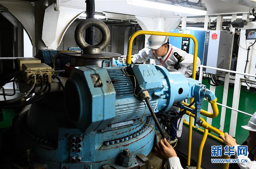 1月15日,??诤J戮止ぷ魅藛T在粵海鐵4號客滾船的機艙內檢查舵機。