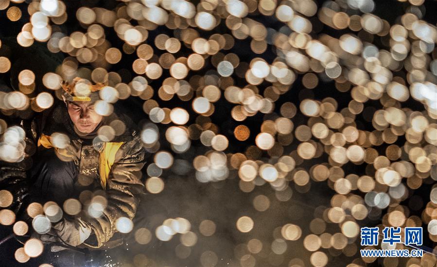 1月15日凌晨,中鐵十一局施工人員在西安站改現(xiàn)場切割鋼軌。新華社記者陶明攝