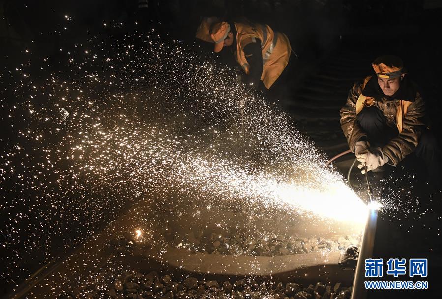 1月15日凌晨,中鐵十一局施工人員在西安站改現(xiàn)場(chǎng)切割鋼軌。新華社記者陶明攝