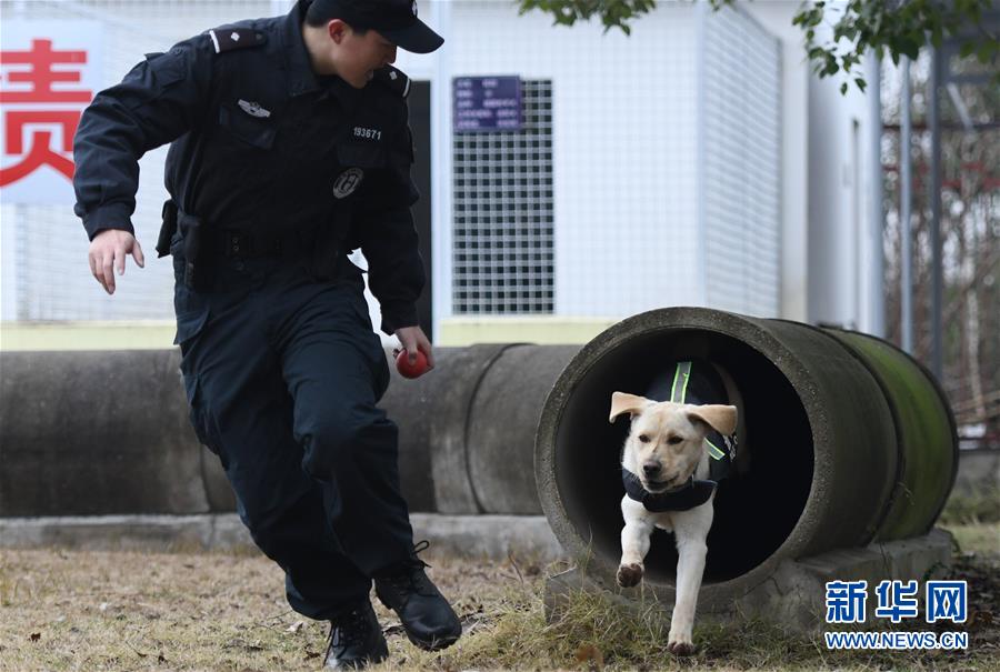 1月15日,警犬“皮特”在訓(xùn)導(dǎo)員丁巖的帶領(lǐng)下進(jìn)行崗前特訓(xùn)。 新華社記者 程敏 攝