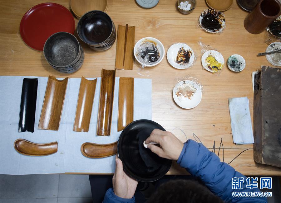 1月15日,吳榮強(qiáng)在龍泉市牛頭嶺村“七分醉”工作室制作漆器。新華社記者翁忻旸攝