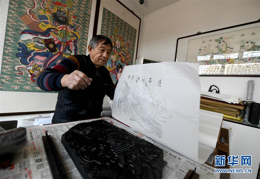 1月16日,霍慶順在套印年畫《連年有余》。