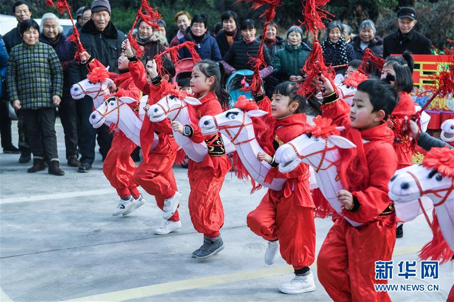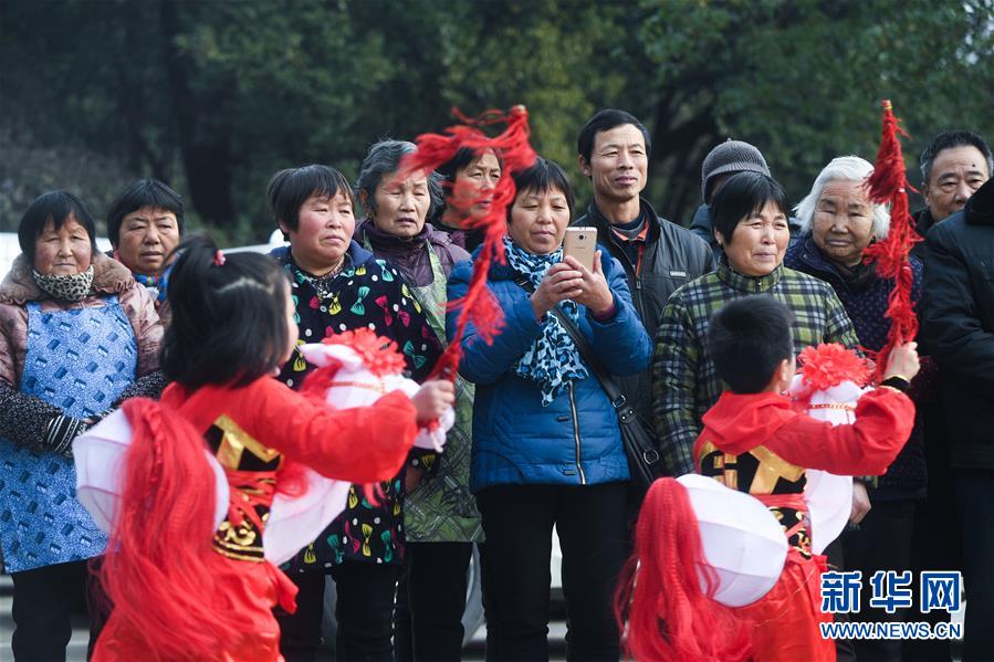 1月16日,新塘村村民觀看傳統(tǒng)非遺項目——下箬馬燈。下箬馬燈是發(fā)源于長興縣的民間舞蹈,距今已有1000多年歷史。 臨近春節(jié),浙江省長興縣開發(fā)區(qū)中心幼兒園的老師和孩子們來到長興縣太湖街道下屬的新塘村,為村民表演文藝節(jié)目,用喜慶的傳統(tǒng)舞蹈營造節(jié)日氣氛。另外孩子們還用紙盒、瓶子、彩色包裝紙等廢舊物品制作了環(huán)?;?,送給村民,倡導(dǎo)低碳環(huán)保的節(jié)日新風。 新華社記者 徐昱 攝