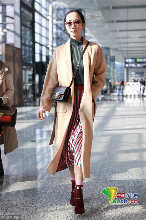 2019年1月17日,上海,韓雪現(xiàn)身機(jī)場,穿著條紋紗裙露出小腿,十分抗凍,她搭配經(jīng)典的駝色大衣,氣質(zhì)出眾在機(jī)場人群中相當(dāng)搶鏡。