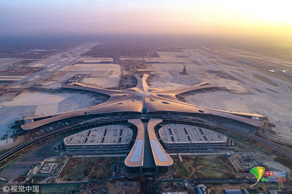 2018年12月19日,北京大興國際機場航站樓的屋面已基本完工,一只金色“鳳凰”完整地出現(xiàn)在北京城南。視覺中國