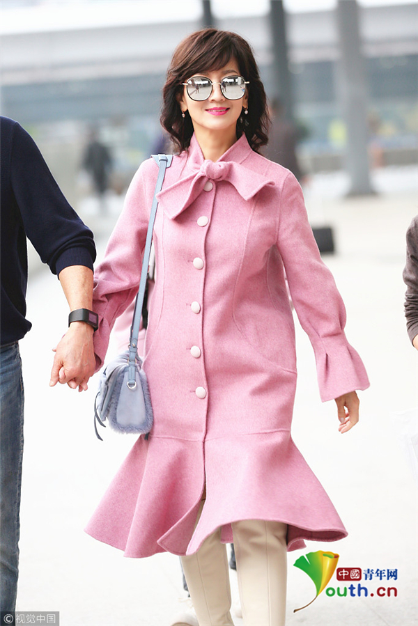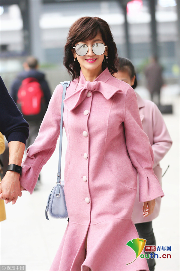 1月22日,廣東深圳,近日,趙雅芝與丈夫黃錦燊現(xiàn)身機場,黑超遮面的她身著粉色昵子魚尾大衣,氣質(zhì)超群,一路獲粉絲跟隨,共先生黃錦燊牽手同行。