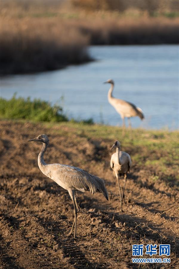 3月7日,在以色列阿格蒙胡拉鳥類和自然公園,幾只灰鶴在水邊休息。新華社記者郭昱攝